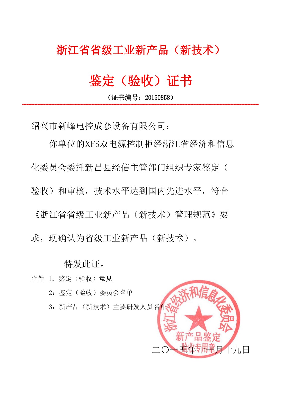 XFS雙電源控制柜 20150858-新產(chǎn)品科技證書