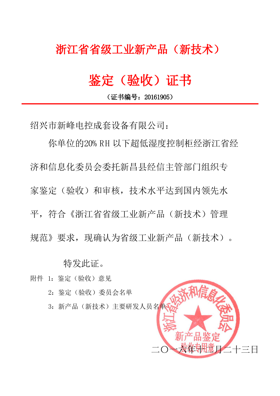 20%RH以下超低濕度控制柜 20161905-新產(chǎn)品科技證書