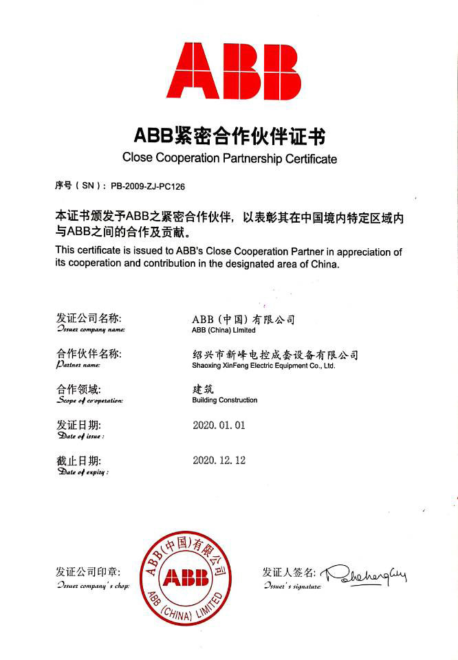 ABB緊密合作伙伴證書-企業(yè)榮譽(yù)證書